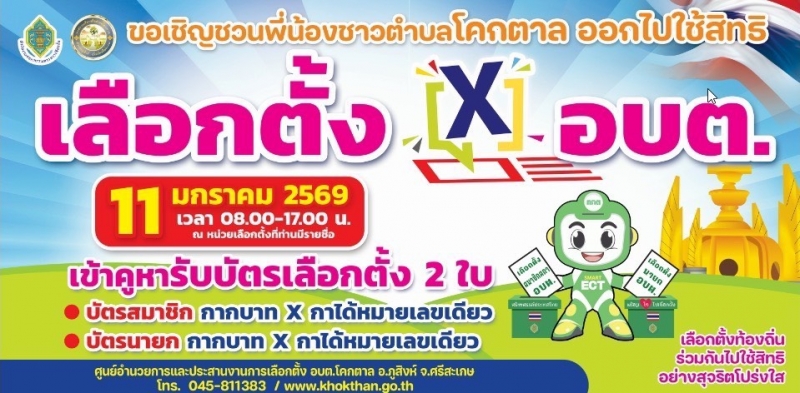 องค์การบริหารส่วนตำบลโคกตาล ขอเชิญชวนประชาชนผู้มีสิทธิเลือกตั้ง ออกไปใช้สิทธิเลือกตั้ง ในวันอาทิตย์ที่ 11 มกราคม 2569